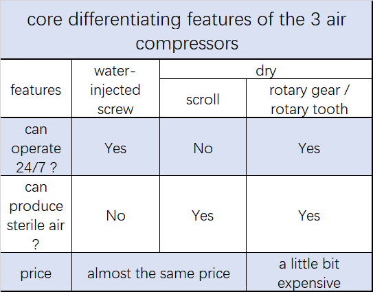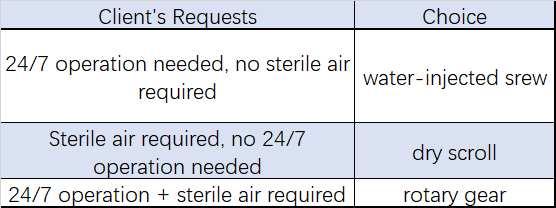 When it comes to clients’ requests, we just need to figure out two things: do they need the compressor to run 24/7, and do they need it to produce sterile air?
